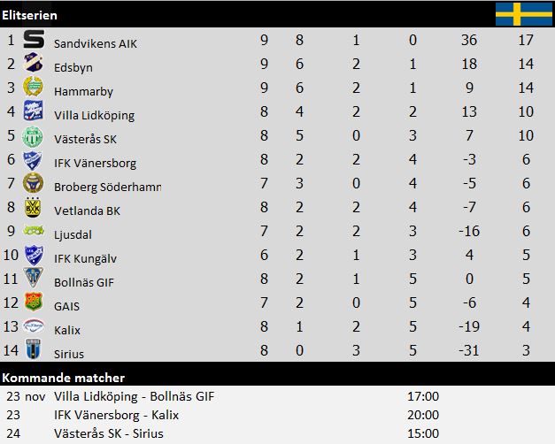 Sandviken rusar vidare i toppen av Elitserien medan Ljusdal överraskande tog poäng mot Edsbyn i Hälsingederbyt. Kungälv var alltjämt för givmilda i kvällens bortamöte mot ett bra Vetlanda som vann stort.